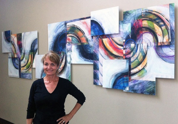 Sandra in front of a piece she created and installed in a Bank in Phoenix through SCAPE, a gallery in Newport, California.